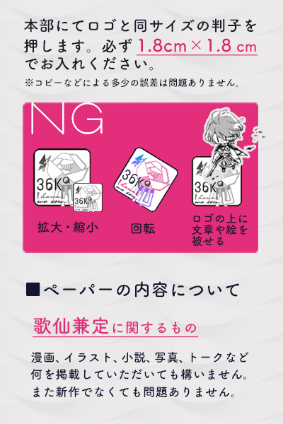 コピーなどによる多少の誤差は問題ありません。※複数種のペーパーを発行される場合、ロゴの掲載は【1サークル2種】まで(委託含む)でお願いいたします。