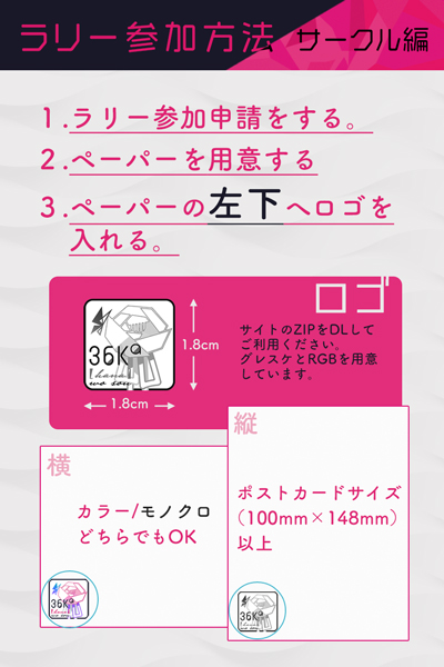 冊子、特殊形状でも問題ありませんが、必ず左下にして提出できる場所にロゴをお願いいたします。<ペーパー配付方法> プチ当日、ご自身のスペースから配布をお願いいたします。